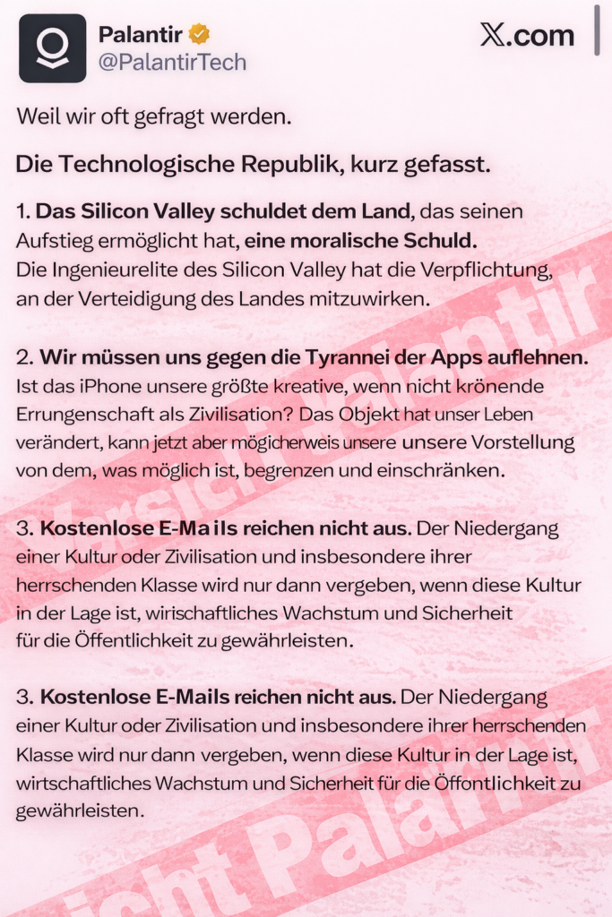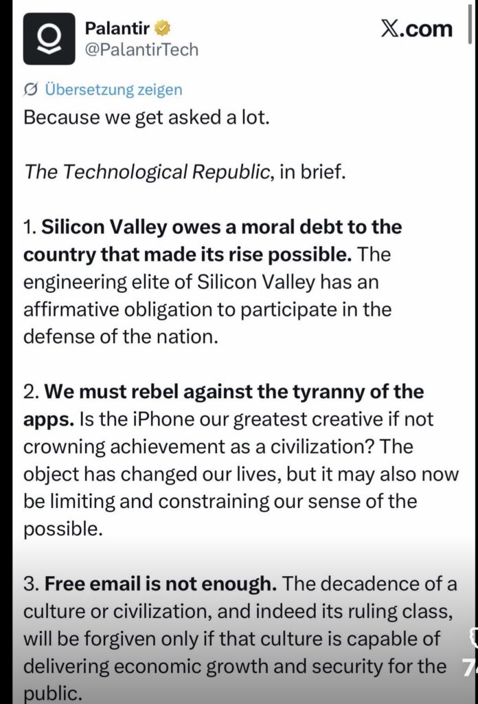 Gleichzeitig fordert Palantir mehr Einfluss von Technologie auf staatliche Aufgaben.