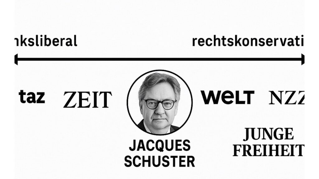 Jacques Schuster steht klar im konservativ-liberalen Lager, mit deutlicher Tendenz nach rechts der politischen Mitte.