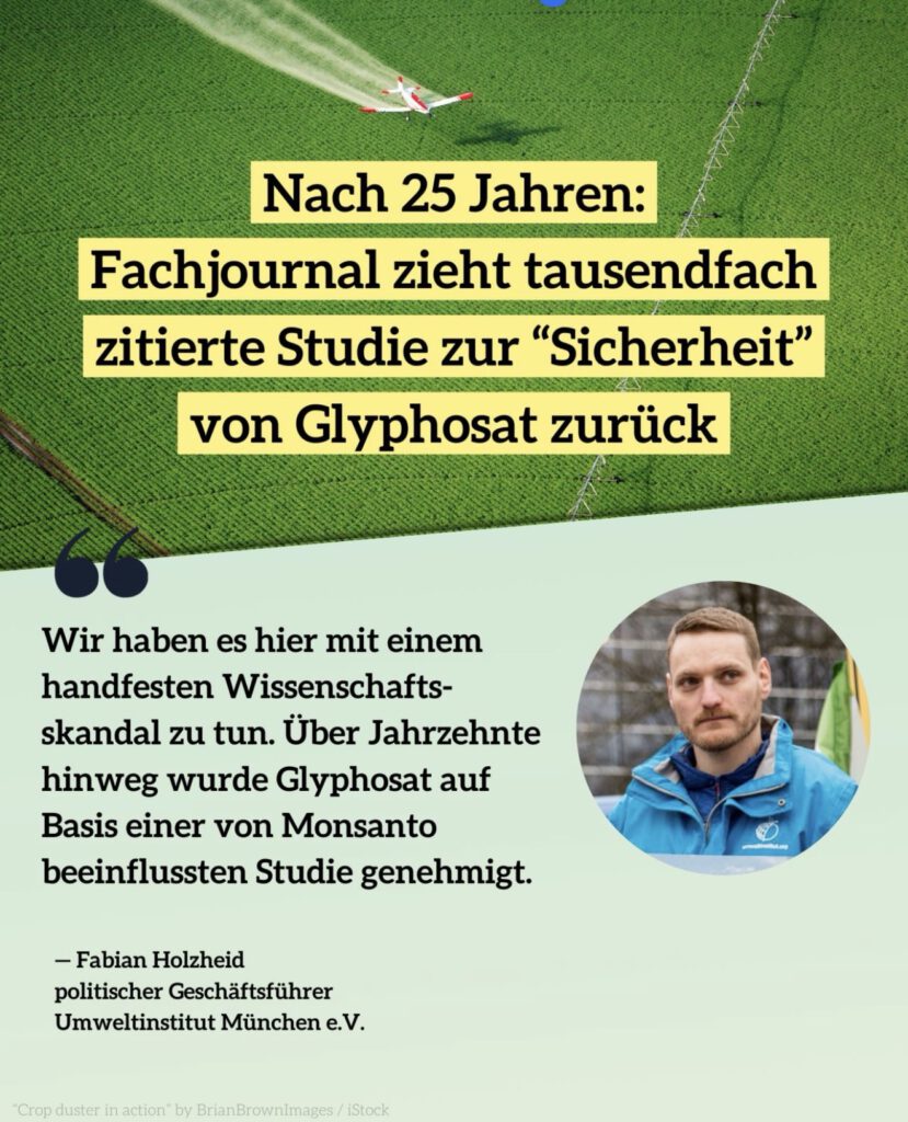 Eine zentrale Glyphosat-Studie aus dem Jahr 2000, die über Jahrzehnte großen Einfluss auf die Bewertung der Sicherheit von Glyphosat hatte, ist nun formell zurückgezogen worden. Die Fachzeitschrift „Regulatory Toxicology and Pharmacology“ begründet den Schritt mit gravierenden Zweifeln an der wissenschaftlichen Integrität des Papiers. Es stellt sich heraus: die zentrale Schlussfolgerung – Glyphosat sei nicht krebserregend – ist überhaupt nicht belastbar! (Was in der Zwischenzeit ja sowohl die Internationale Krebsforschungsagentur IARC als auch das Ramazzini-Institut bestätigt haben)