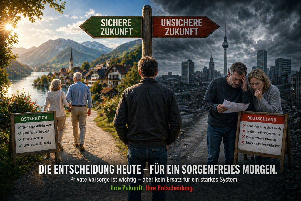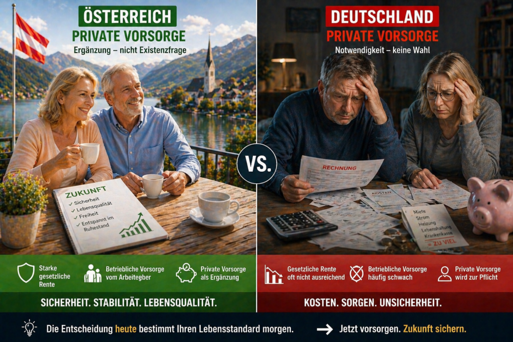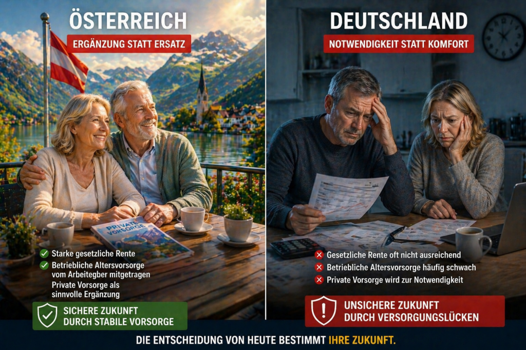 Deutschland setzt stark auf private Vorsorge, weil gesetzliche Rente und bAV oft nicht ausreichen. Österreich ist weniger abhängig davon, weil das Gesamtsystem stärker trägt.