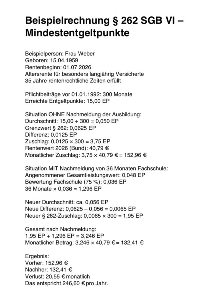 Wird nun eine Ausbildungszeit – etwa eine Fachschulzeit – nachgemeldet, wird diese zwar bewertet. Gleichzeitig verändert sie jedoch den Gesamtleistungswert, der für die Berechnung des Zuschlags nach § 262 maßgeblich ist.