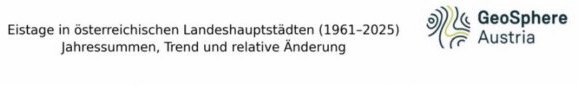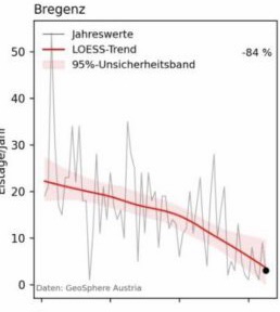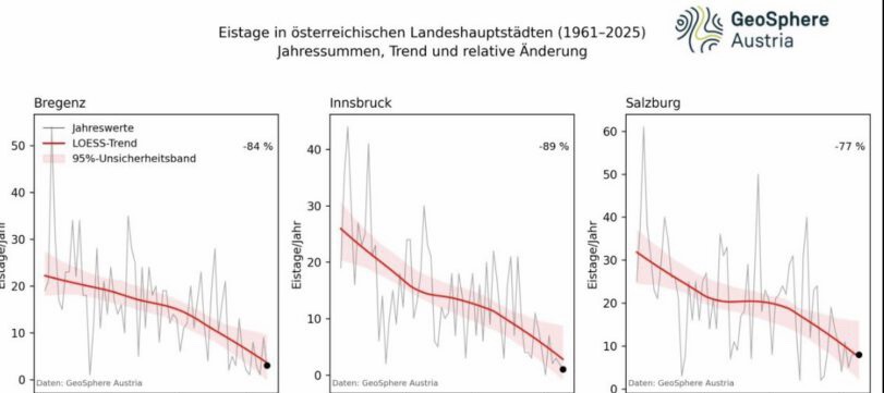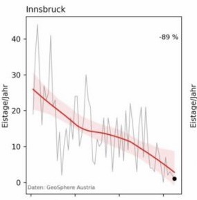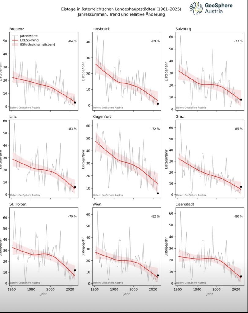 Solche Wetterlagen fühlen sich nach „früher“ an – und werden daher oft als Argument gegen den Klimawandel herangezogen. Ein Blick auf die langfristigen Beobachtungsdaten zeigt jedoch ein anderes Bild. Die Auswertung der Jahressummen der Eistage in allen österreichischen Landeshauptstädten seit 1961 macht den Unterschied zwischen Wetter und Klima deutlich: Die dünnen Linien stehen für einzelne Jahre (Wetter), die rote Linie für den langfristigen Trend (Klima).
