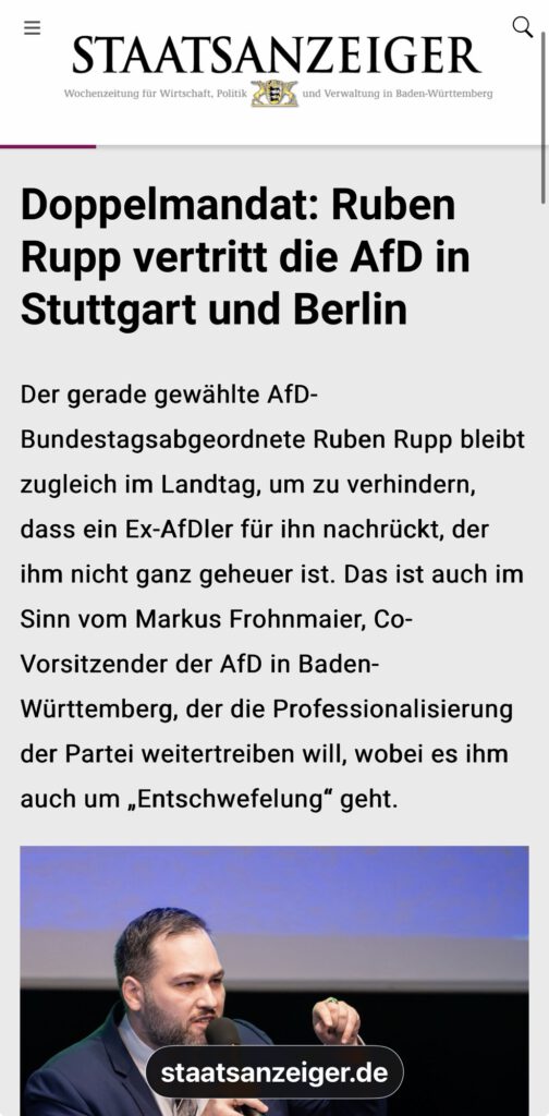 Nach Recherchen des Staatsanzeigers Baden-Württemberg würde bei einem Mandatsverzicht Rupps im Landtag ein Ex-AfD-Mitglied nachrücken, das die Partei bereits vor Jahren im Streit verlassen hatte. Innerparteilich gilt diese Person als nicht mehr zuverlässig und wird einem früheren Machtzirkel der AfD zugerechnet. Genau das will Rupp – mit Rückendeckung aus der AfD-Landesspitze – verhindern.