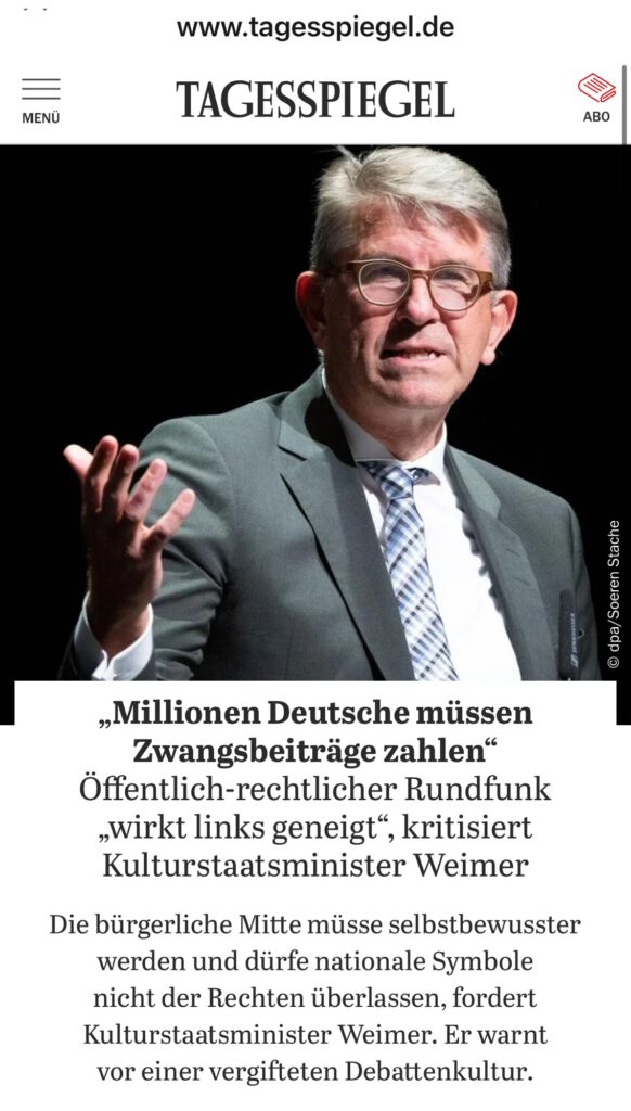 Kulturamtschef Weimer bezeichnet die Gebühren für den öffentlich-rechtlichen Rundfunk als Zwangsgebühren und ist der Auffassung, dass diese Einrichtungen zu weit links stehen.