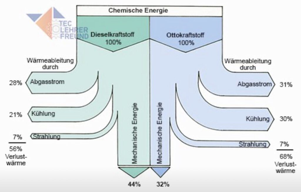 Ein Verbrennungsmotor ist eine Wärmekraftmaschine, die physikalisch im Wirkungsgrad durch den Carnot Prozess begrenzt ist. Hocheffiziente Verbrennungsmotoren mit sehr hoher Verdichtung, Turboaufladung, variabler Ventilsteuerung und Direkteinspritzung schaffen heute etwa 45 Prozent Wirkungsgrad beim Diesel und rund 30 Prozent beim Benzinmotor. Bei idealen Betriebstemperaturen. Nach dem Kaltstart und in der Stadt auch weniger.