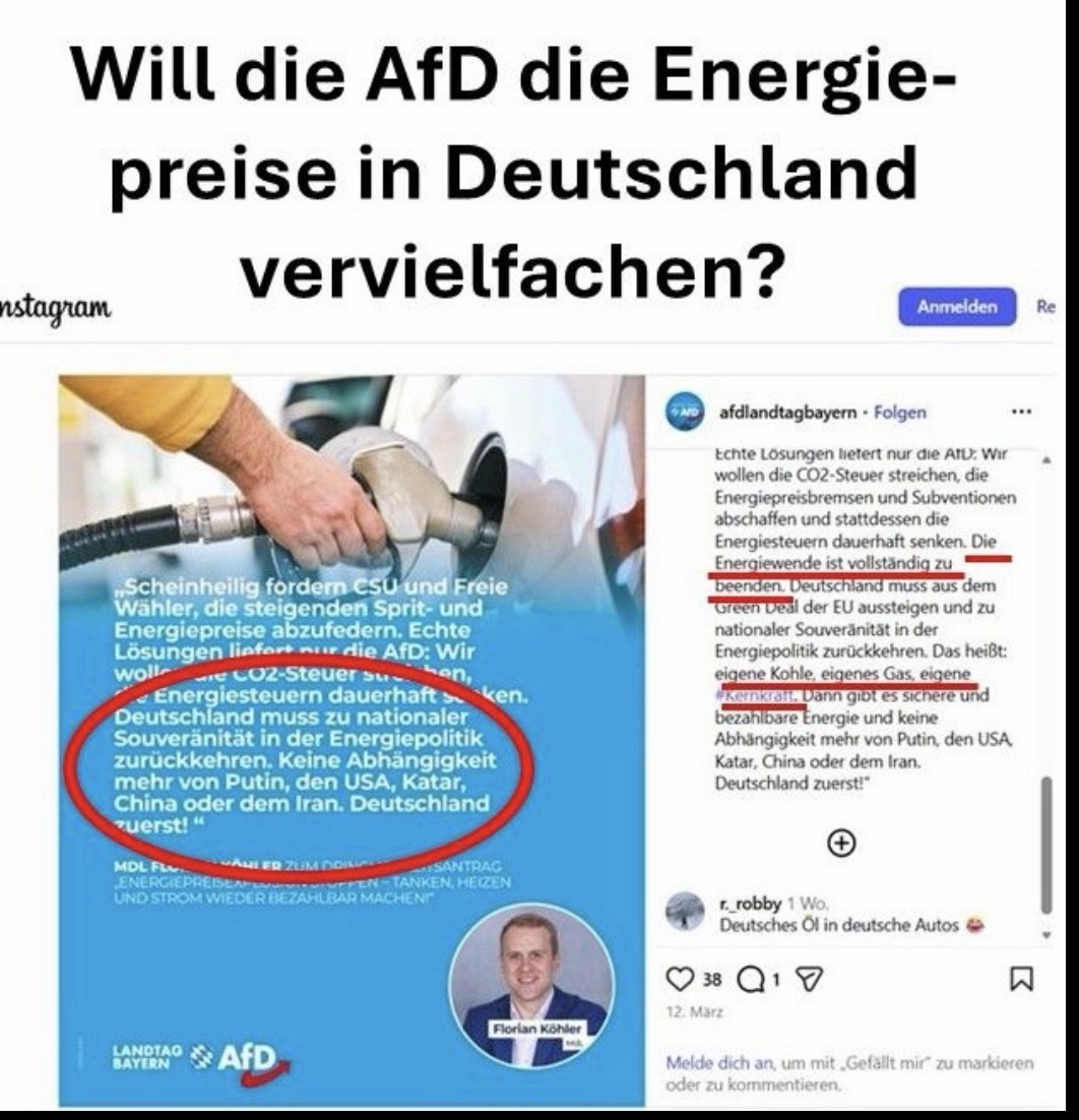 „Deutschland muss zu nationaler Souveränität in der Energiepolitik zurückkehren. Keine Abhängigkeit mehr von Putin, den USA, Katar, China oder dem Iran.“