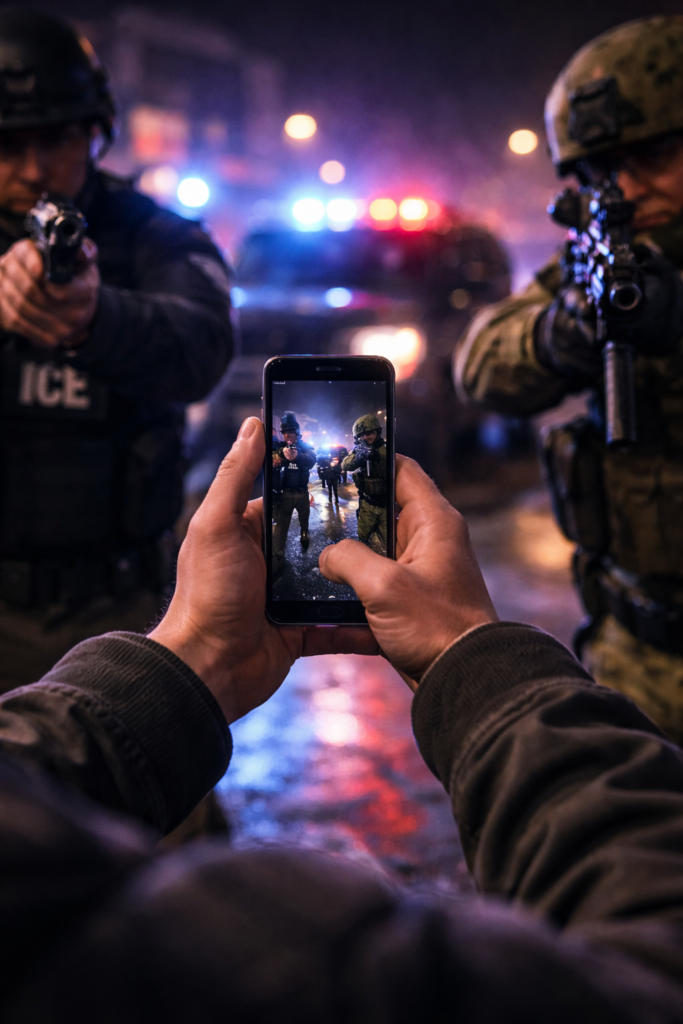 In einem offiziellen Statement behauptet Homeland Security nun, der Mann habe ICE mit einer Handschusswaffe bedroht. Videos zeigen hingegen, wie er ein Handy in der Hand hält und filmt, auch dann noch, als er einer Frau zur Seite springt, die festgenommen werden soll.