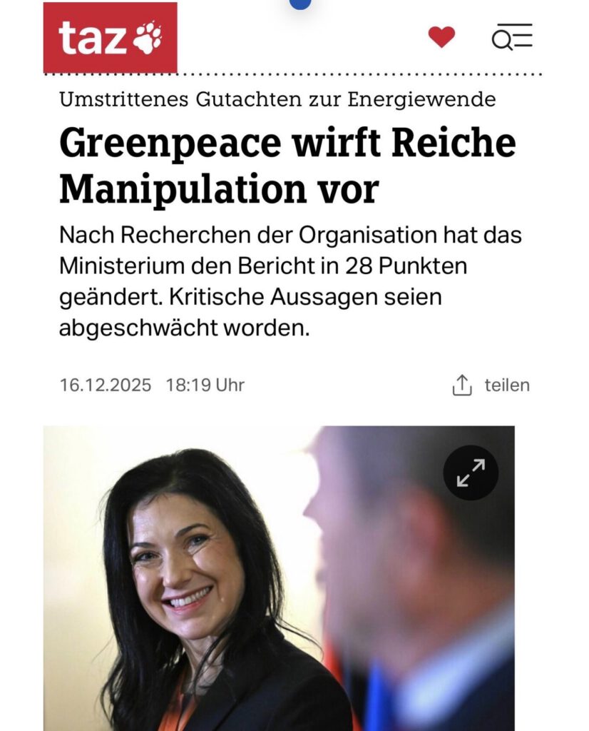Greenpeace erhebt schwere Vorwürfe gegen Bundeswirtschaftsministerin Katherina Reiche. Das Monitoring-Gutachten zur Energiewende soll nachträglich inhaltlich verändert worden sein, um es politischen Zielsetzungen anzupassen.