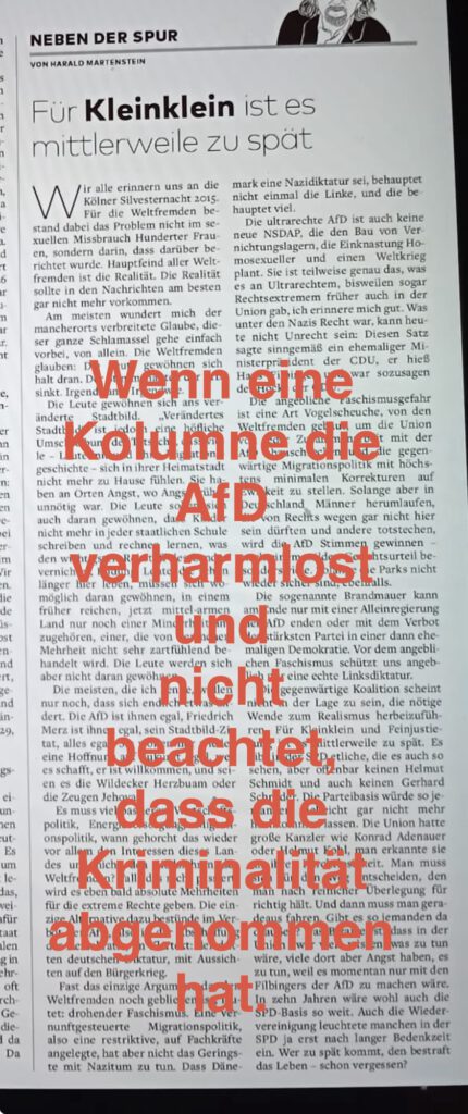 Der Text ist durchzogen von Schuldumkehr: Nicht die AfD gefährdet die Demokratie – sondern die „Weltfremden“, also im Klartext: Medien, SPD, Grüne, Liberale. Nicht rassistische Hetze, sondern angeblich „beschönigende Politik“ sei das Problem. Und wer auf Faschismus hinweist, wird als hysterisch dargestellt: Die „Faschismuskeule“ sei nur eine Vogelscheuche, schreibt Martenstein.