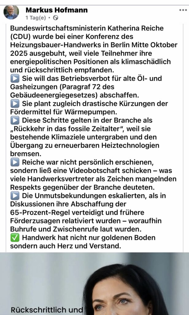 Bundeswirtschaftsministerin Katherina Reiche (CDU) wurde bei einer Konferenz des Heizungsbauer-Handwerks in Berlin Mitte Oktober 2025 ausgebuht, weil viele Teilnehmer ihre energiepolitischen Positionen als klimaschädlich und rückschrittlich empfanden.