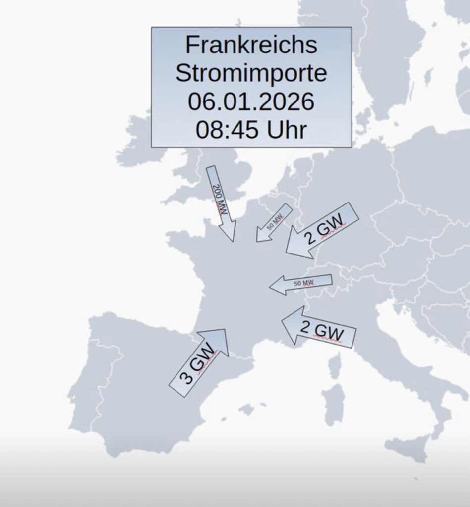 Ist aber beides nicht richtig, denn auch Frankreich hatte noch ein paar Reserven im Land. Die hochzufahren wäre aber teurer gewesen als den Strom einfach im Ausland einzukaufen. Genauso hat Deutschland zu diesem Zeitpunkt ebenfalls Strom aus anderen Ländern importiert, nur halt nicht aus FR.
