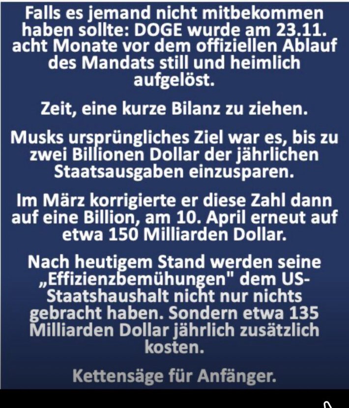 „Weder wurde die Staatsverschuldung abgebaut noch der Staatsapparat modernisiert. DOGE war und ist ein Projekt, das den Privatinteressen weniger zu Lasten der vielen dient und dabei zeigt, welch dramatischen Einfluss überreiche Menschen wie Musk auf die US-Politik haben. Und wie sehr das einer Demokratie und einem funktionierenden Staatswesen schadet.