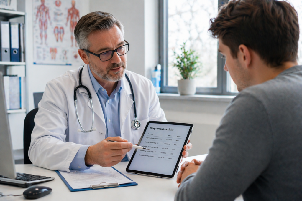 - alle Vorerkrankungen vollständig angeben – idealerweise mit Diagnoseübersicht des Hausarztes.