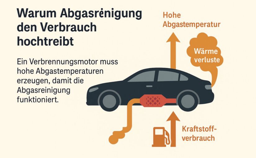 Ein zentraler Punkt beim Verbrenner wird in der öffentlichen Debatte fast nie erwähnt: Ein Verbrennungsmotor muss für die gesetzliche Abgasreinigung hohe Abgastemperaturen erzeugen. Ohne diese Temperaturen funktionieren Katalysator, Partikelfilter und SCR-System nicht zuverlässig.