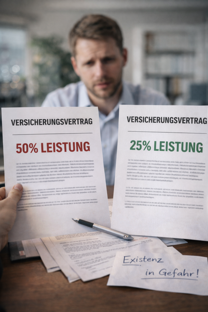 Ein Makler bezeichnet sich als unabhängig und vermittelt einem Kunden eine Police, die erst ab 50 % Berufsunfähigkeit leistet. Jahre später wird der Kunde jedoch nur zu 40 % berufsunfähig – und erhält keine Leistung.